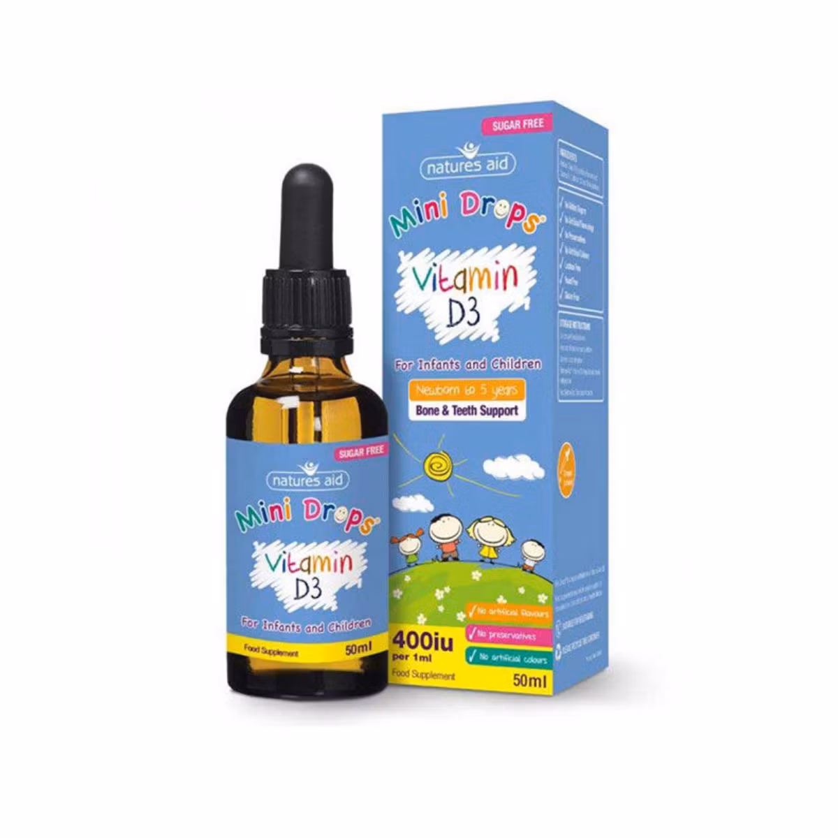 Natures Aid Vitamin D3 është suplement që përmban vitaminë D për fëmijët që nga lindja deri 5 vjeç. Vitamina D luan shumë role të rëndësishëm në trup. Ndihmon në përthithjen e Kalciumit dhe mbështet zhvillimin e shëndetshëm të kockave tek fëmijët. Gjithashtu mbështet funksionin e shëndetshëm të muskujve dhe funksionimin normal të sistemit imunitar tek fëmijët.