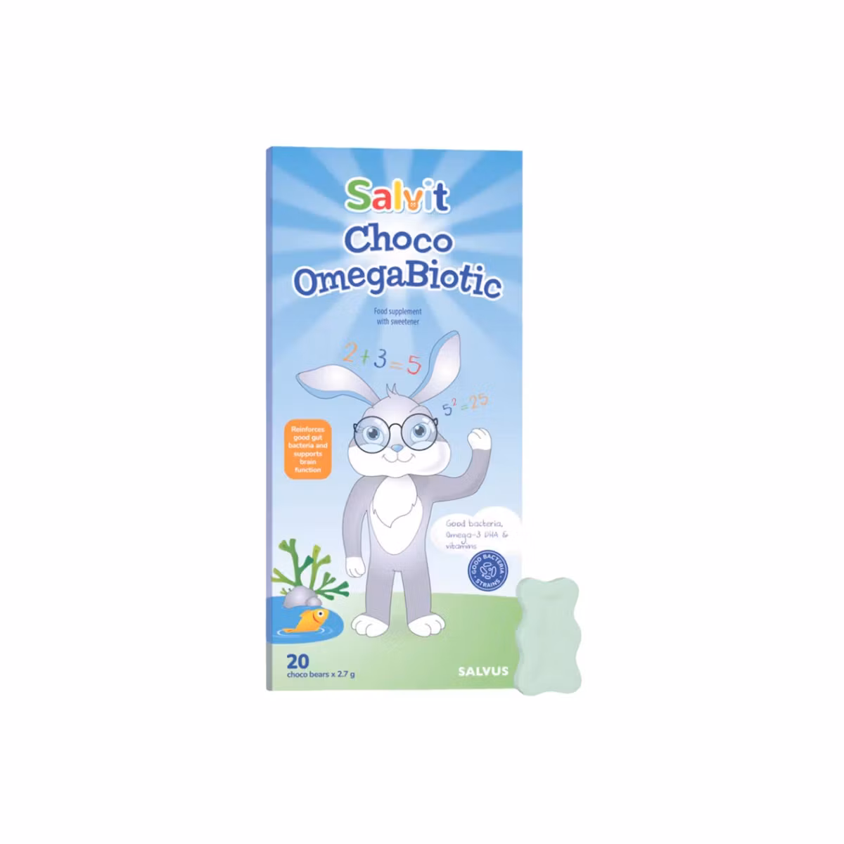 Salvit Choco Omegabiotic Bears 20 është një suplement ushqimor në formë arushësh përtypës me shije çokollate, i formuluar për të mbështetur shëndetin e sistemit tretës dhe zhvillimin e përgjithshëm të fëmijëve. Kombinimi i probiotikëve me omega yndyrna kontribuon në ekuilibrin e florës intestinale, mbështet funksionimin e trurit dhe mirëqenien e përditshme. Forma argëtuese dhe shija e këndshme e bëjnë marrjen e suplementit të lehtë dhe të pëlqyeshme, duke e kthyer në një zgjedhje praktike për përdorim të përditshëm.