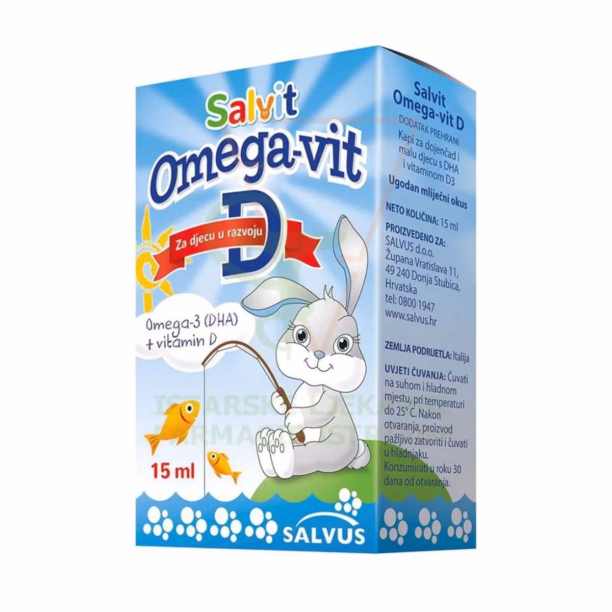 Suplement ushqimor në formë pikash me Omega 3 dhe vitaminë D për foshnje dhe fëmijë. Salvit Omega-Vit D me shije qumështi, përmban 20 mg Acid Dokosaheksaenoik (DHA) nga vaji i mikroalgës Ulkenia dhe 10 mcg (400 IU) vitaminë D3. DHA kontribuon në zhvillimin normal të shikimit të fëmijëve deri në 12 muaj. Vitamina D është e nevojshme për rritjen dhe zhvillimin normal të kockave të fëmijëve. Pikat mund të merren vetëm ose të holluara në lëng frutash ose qumësht.
