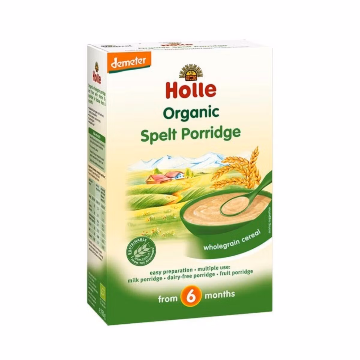 Holle Organic drithëra integrale me bollgur është i përshtatshëm për foshnja mbi 6 muaj si pjesë e një diete të larmishme. Përmban Tiaminë (vitaminë B1) dhe miell farro që ndihmojnë në rritjen dhe zhvillimin e shëndetshëm të fëmijës. Mund të përdoret si ushqim me qumësht ose pa përmbajtje bulmeti si dhe me ndonjë formulë tjetër për foshnja.
