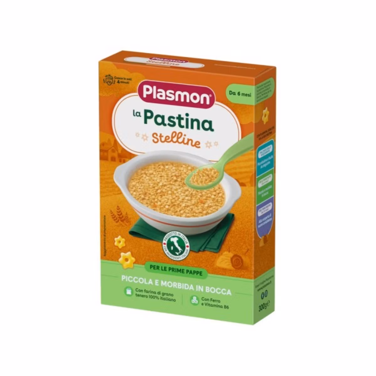 Makarona të vogla në formë yjesh, e përshtatshme për foshnjat 6 muaj +. Ky paketim prej 300 gr ofron një opsion të shijshëm dhe të ushqyeshëm për vaktet e fëmijës suaj. E lehtë për t’u gatuar dhe ideale për të prezantuar foshnjën tuaj me ushqimet e ngurta.