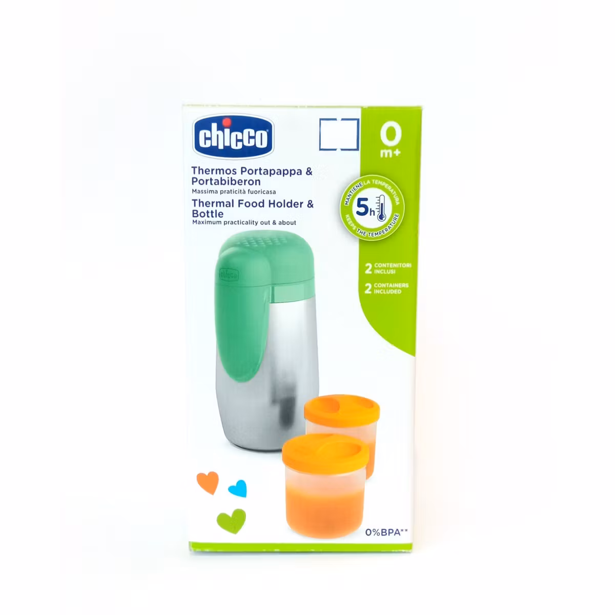 Chicco Thermal Food Holder&Bottle është termus i përshtatshëm për ushqim dhe shishe. Falë tij ju mund t`i merrni me vete kudo shishet e fëmijës suaj si dhe të ruani ushqimin për një periudhë nga 2 deri në 5 orë. Kapaku multifunksional kthehet në një tas praktik për të ushqyer fëmijën tuaj. Nuk ka rrezik për rrjedhje.