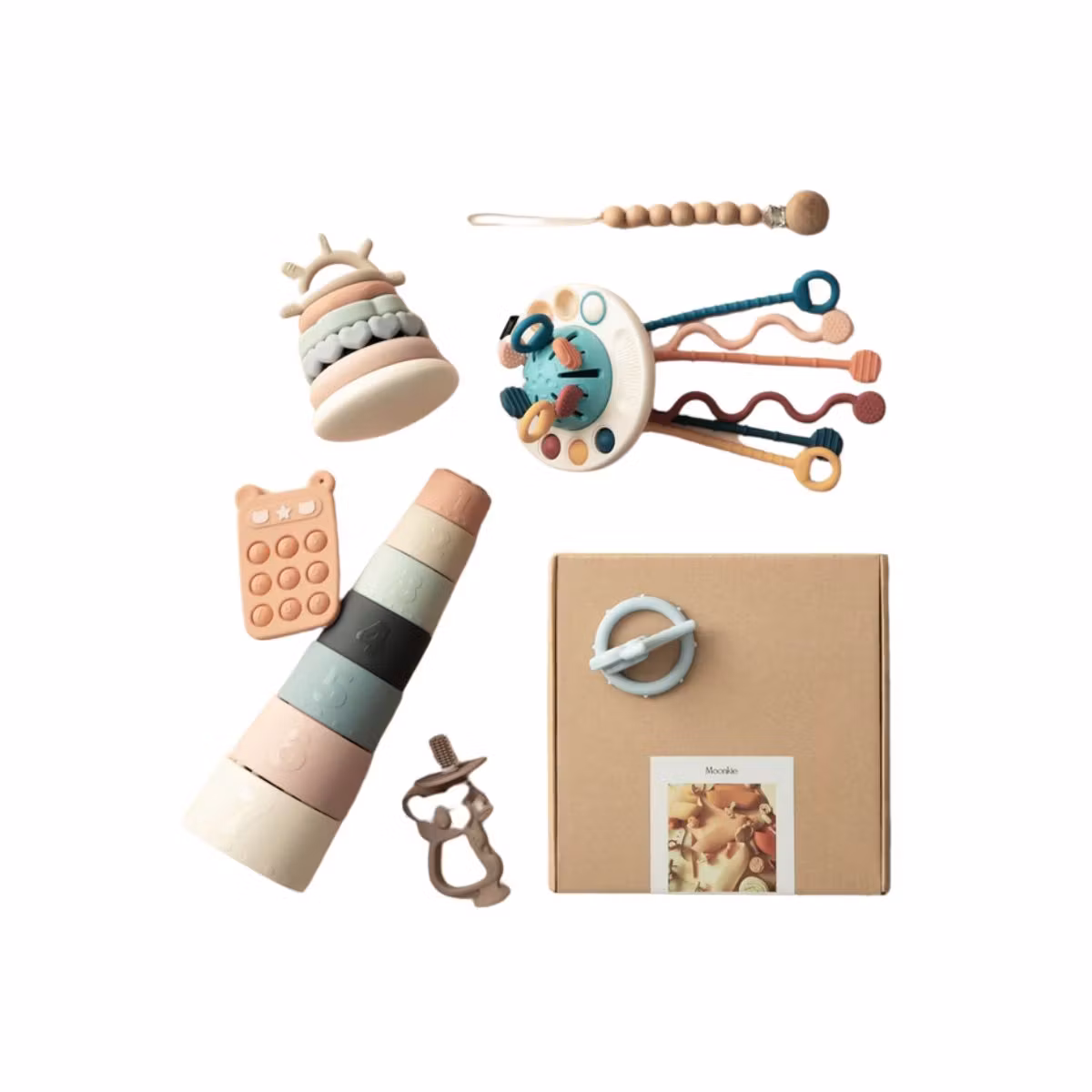 Përfshin 3 lodrat: lodra me pjesë lëvizëse, lodra me unaza dhe lodra me kupa, si dhe një zinxhir për biberonin rrens.