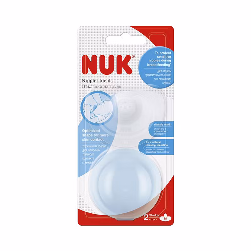 Mbrojtëse silikoni NUK për të mbrojtur kokën e gjirit e cila bëhet më e ndjeshme dhe e irrituar gjatë ushqyerjes me gji. Nipple shield ndihmon duke mbrojtur gjirin dhe në të njëjtën kohë lejon ushqyerje të qetë. Një nga veçoritë dalluese është silikoni i hollë gossamer që siguron rehati dhe fleksibilitet. Forma unike trekëndore mundëson kontakt optimal të lëkurës midis nënës dhe fëmijës dhe jep ndjesi natyrale të ushqyerjes me gji. Mbrojtësja ka në sipërfaqe me struktura të ndryshme dhe katër vrima pirjeje, dhe hunda e foshnjës ka hapësirë të mjaftueshme për të marrë frymë lirisht. NUK Nipple Shields vjen në një kuti praktike, duke e bërë të lehtë mbajtjen higjienike të produktit. E testuar klinikisht.
