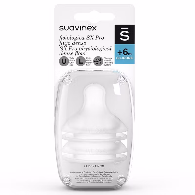 Suavinex Sx Pro Physio Silicon është një kokë biberoni prej silikoni të një cilësie të lartë e përshtatshme për t’u përdorur në fëmijë nga mosha 6 muaj e në vazhdim. Forma anatomike e biberonit i ngjason formës së gjirit gjatë gjidhënies. Ka një vendosje të mirë në gojën e fëmijës duke ushtruar pozicion minimal në qiellzë dhe nuk e dëmton atë. Nuk përmban BPA.