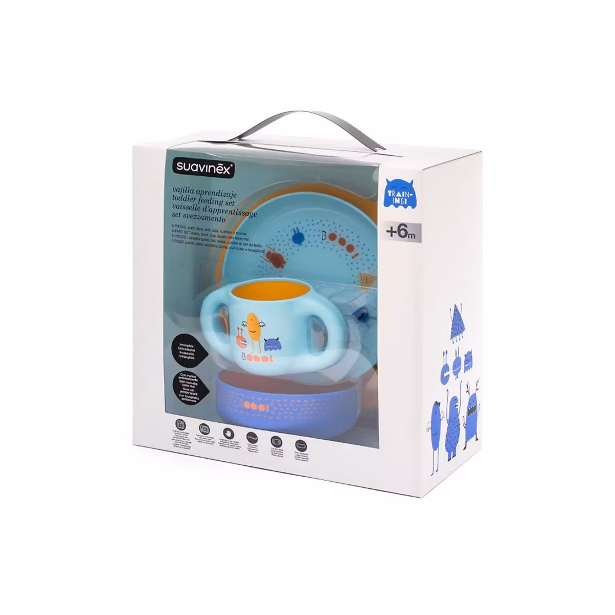 Suavinex Set Ushqimi Për Djem 6 Muaj+ është një set i plotë për ushqimin e foshnjave që përfshin gjithçka që ju nevojitet për të filluar ushqyerjen e ngurtë. Seti përfshin një pjatë, një filxhan trajnues, një lugë dhe një gushore, të gjitha të dizajnuara me ngjyra dhe motive tërheqëse për djemtë. Produktet janë bërë nga materiale të sigurta dhe të qëndrueshme, pa BPA, dhe janë të përshtatshme për përdorim të përditshëm. Ky set është i lehtë për t'u përdorur dhe pastruar, duke e bërë atë ideal për prindërit që kërkojnë të fillojnë ushqyerjen e foshnjës së tyre me stil dhe praktikë. Një dhuratë e shkëlqyer për çdo prind të ri.