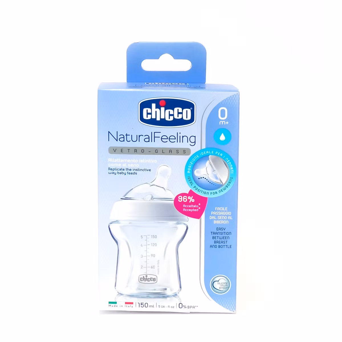 Chicco Glass Baby Bottle është zgjidhja perfekte për foshnjat nga lindja e në vazhdim. Forma anatomike e saj është e ngjashme me gjirin e nënës duke bërë kalimin ndërmjet ushqyerjes me gji në atë me biberon më të lehtë dhe të sigurt. Shishja është e pajisur me një valvul antikolike e cila ndihmon në reduktimin dhe parandalimin e dhimbjeve të barkut. Përbëhet nga qelqi i një cilësie të lartë mjekësore. Koka e biberonit është në material silikoni e cila ofron një rrjedhje të njëtrajtshme të qumështit.
