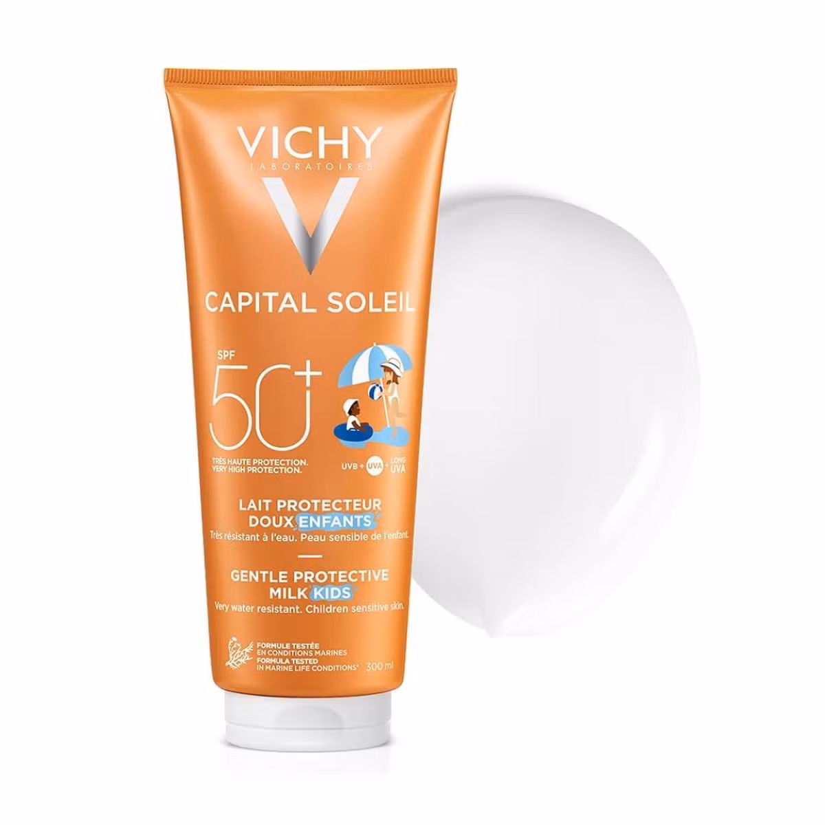 Qumështi Vichy Soleil SPF50+ ofron mbrojtje të lartë kundër rrezeve UVA dhe UVB. I përshtatshëm për lëkurën e ndjeshme të fëmijëve, përmban Ujë Mineralizues Vichy dhe Vitaminë E për të hidratuar dhe mbrojtur lëkurën nga dëmtimet e diellit. Formula është rezistente ndaj ujit, duke siguruar mbrojtje të qëndrueshme edhe gjatë lojërave në ujë. Është hipoalergjik dhe pa parabene, duke e bërë të sigurt për të gjitha llojet e lëkurës, përfshirë ato me ekzemë.