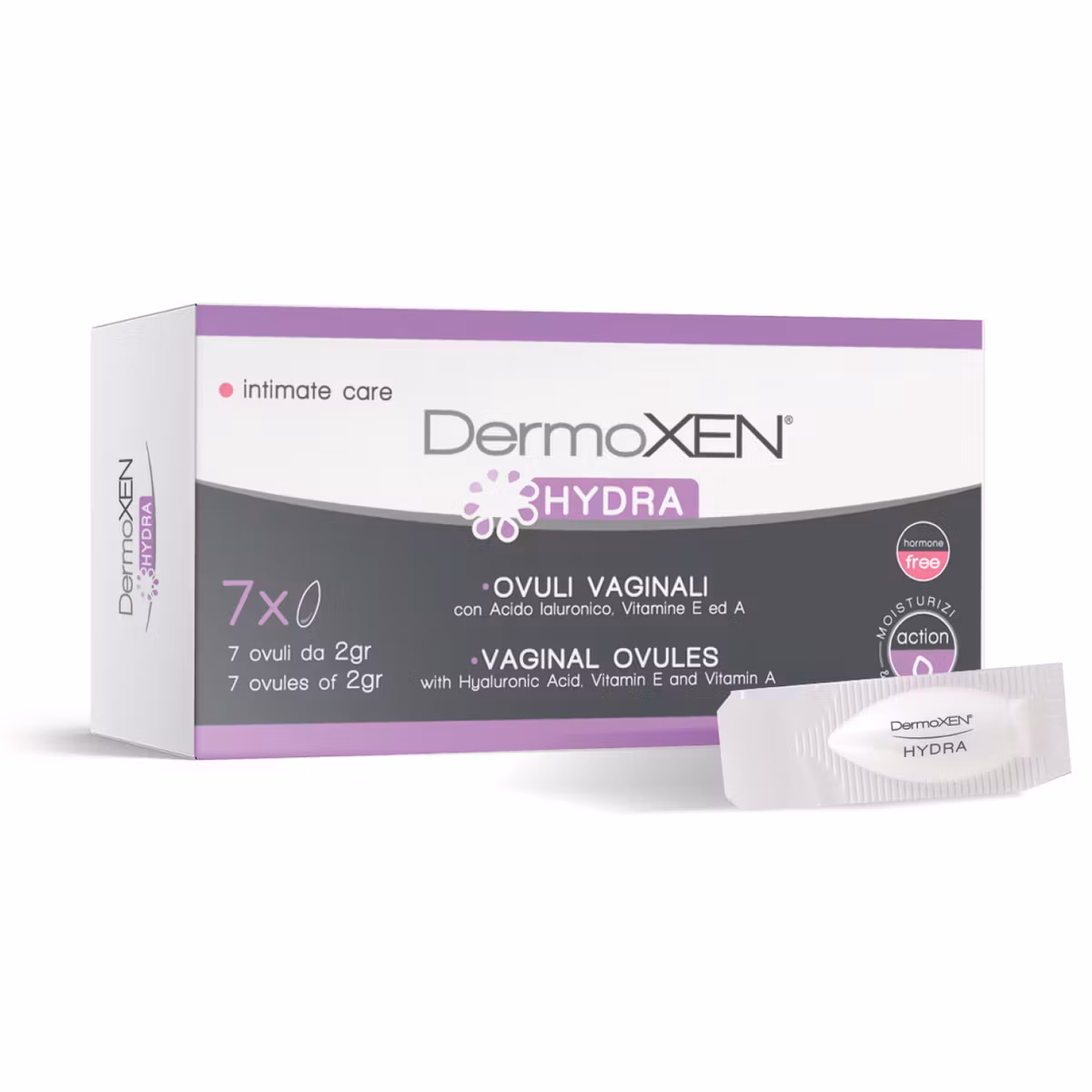 Ovula vaginale Dermoxen Hydra është një produkt gjinekologjik me acid Hialuronik, Aloe Vera, Vitaminë E dhe Vitaminë A i përshtatshëm për mukozën e vaginës tek femrat. Ka një veprim mbrojtës dhe hidratues dhe lehtëson simptomat si djegie, kruajtje dhe irritimet e shkaktuara nga tharja e vaginës.