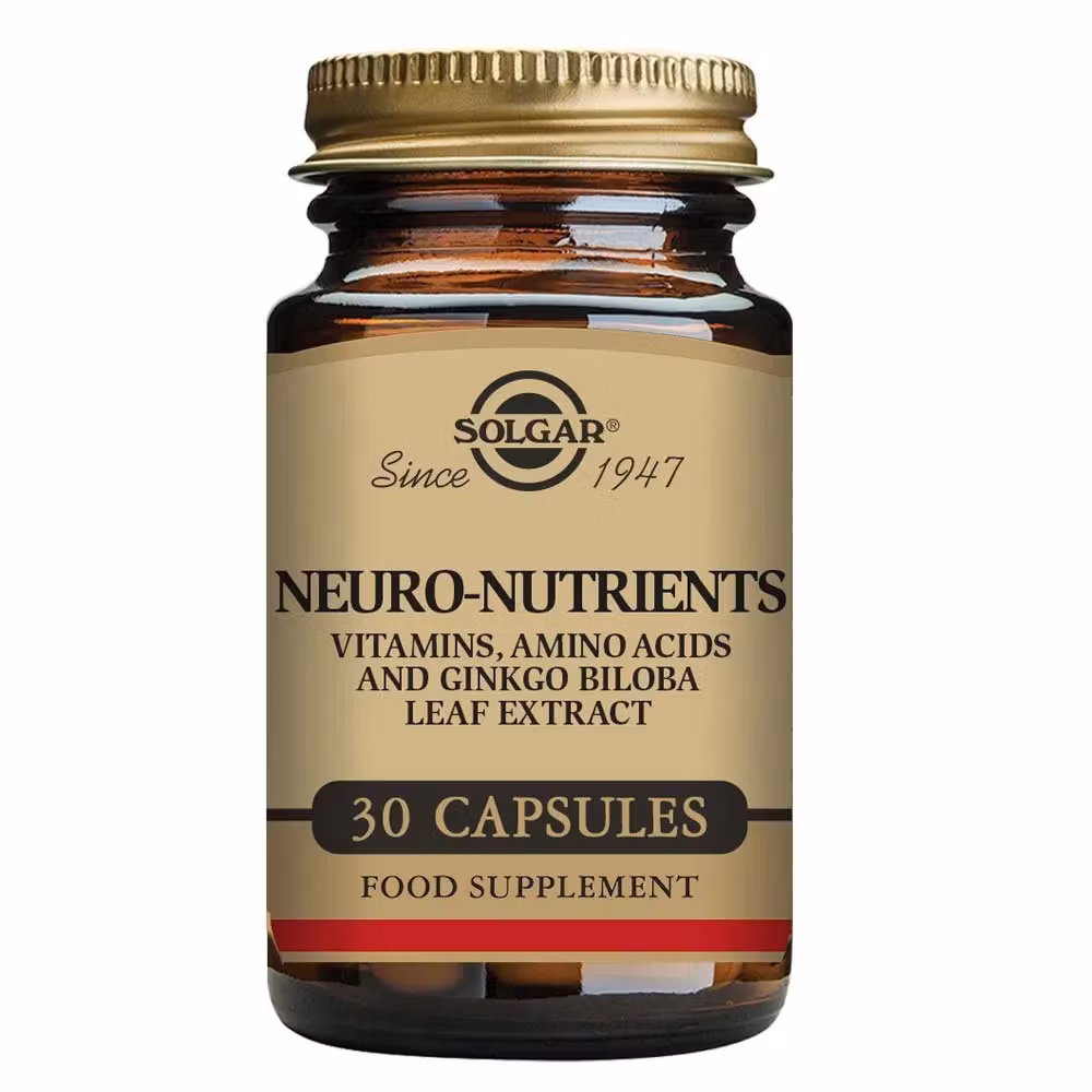 Solgar Neuro Nutrient është një suplement i cili ka në përmbajtje kombinimin e një sërë vitaminave, mineraleve dhe ekstrakteve të Ginkgo Bilobës të cilat mbështetin mirë-funksionimin e sistemit nervor si dhe përmirësojnë përqendrimin. Kompleksi i vitaminave B me vitaminën B1,B2,B3 dhe B6 rregullojnë metabolizmin energjitik dhe pakësojnë ndjesinë e lodhjes. Vitamina C fuqizon veprimin e sistemit imunitar dhe mbron nga stresi oksidativ falë vetive oksiduese që ka. Nuk përmban gluten dhe laktozë.