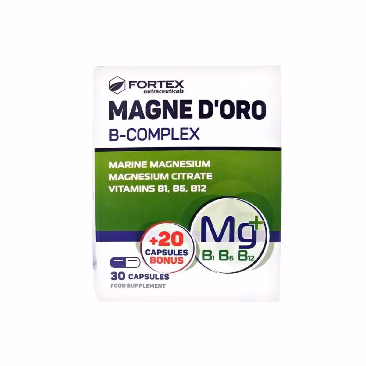Fortex Magne Doro B-Complex është suplement që përmban Magnez dhe vitamina të grupit B- B1, B6 dhe B12. Magnezi ndihmon në funksionimin normal të muskujve, përfshirë në rastet e ngërçeve të muskujve pas ushtrimeve fizike. Rikuperon ekuilibrin elektrolitik dhe ndihmon në funksionimin normal të sistemit nervor. Realizon funksionimin normal të sistemit imunitar dhe redukton lodhjen. Vitamina B1 (hidroklorur tiamine) kontribuon në funksionin normal të zemrës. Vitamina B6 (piridoksina hidroklorur) ndihmon në procesin e formimit të gjakut dhe ndihmon në rregullimin e aktivitetit hormonal. Vitamina B12 (cianokobalamina) kontribuon në formimin normal të qelizave të kuqe të gjakut, funksionimin normal të sistemit imunitar dhe reduktimin e ndjenjave të lodhjes. Vitamina B12 është e përfshirë në procesin e ndarjes së qelizave.