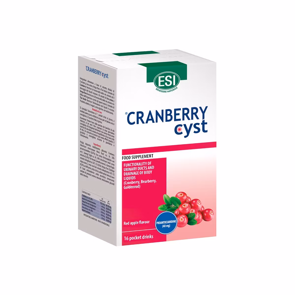 Cranberry cyst është një suplement ushqimor që përdoret për të forcuar dhe pastruar traktin urinar. Ai është në formë tretësire dhe mund të administrohet lehtësisht. Cranberry ka në përmbajtjen e tij: