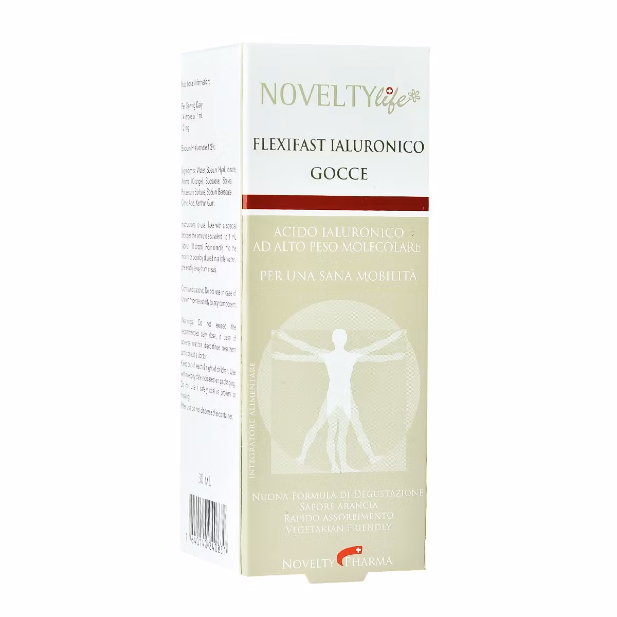 Novelty Life Flexifast Hyaluronic Drops është një suplement i lëngshëm me shije portokalli që përmban acid hialuronik dhe ka veti antioksiduese dhe hidratuese. Acidi hialuronik përmirëson shëndetin e kockave dhe nxit rigjenerimin e tyre. Lidhet me ujin, duke prodhuar një lëng viskoz që mban të lubrifikuar hapësirën midis kockave dhe parandalon fërkimin e tyre, që shkakton dhimbje të pakëndshme. Ndihmon në rritjen dhe zhvillimin e kyçeve dhe kockave duke nxitur rritjen e qelizave të reja. Luan një rol të rëndësishëm në pakësimin e inflamacionit të kyçeve dhe dhimbjeve të shkaktuara nga dëmtimet.