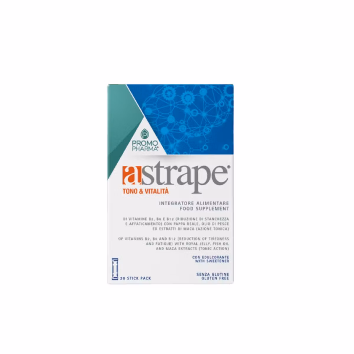 Astrape është suplement me bazë vitaminë B2, B6 dhe B12, vaj peshku dhe ekstrakte të Maca dhe Argjinares. Ndihmojnë në reduktimin e gjendjes së dobësisë dhe lodhjes. Maca vepron si antioksidant dhe mbron qelizat dhe stresi oksidativ. Argjinarja ndihmon në largimin e lodhjes fizike dhe mendore. Kompleksi i vitaminave B ndihmon në mbajtjen të shëndetshme të shëndetit nervor dhe muskulor.