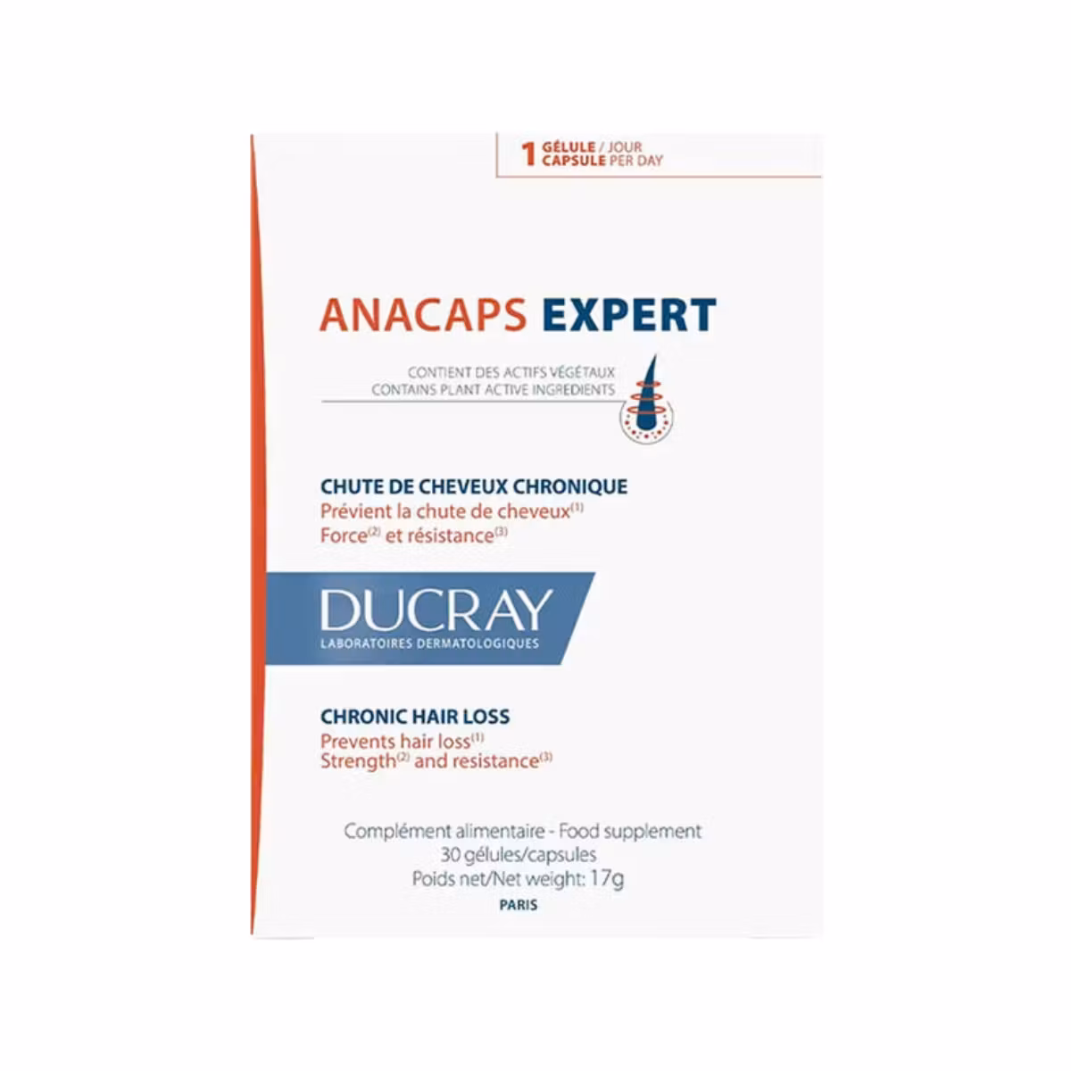 Ducray Anacaps Expert Chronic Hair Loss është një suplement ushqimor ndihmon në rënien akute ose sezonale të flokëve. Mbështet strukturën dhe elasticitetin e flokëve dhe thonjve. Ndihmon në daljen e flokëve të rinj. Biotina, e njohur edhe si Vitamina B7 rrit prodhimin e keratinës duke kontribuar në rritjen e shëndetshme të flokëve dhe thonjve. L-Cisteina dhe L-Metionina ndihmojnë në prodhimin e keratinës që i jep flokut forcë. Vitamina B6 përmirëson zhvillimin e flokëve. Ndihmon në forcimin e fibrave të flokëve duke rritur zhvillimin e flokëve dhe duke ndihmuar në uljen e humbjes së flokëve. Ideale për rënien akute ose sezonale të flokëve. Është i përshtatshëm për të stimuluar zhvillimin e shëndetshëm të flokëve në lëkurën e kokës të dobësuar nga trajtimet e kancerit që nga muaji i parë pas ndërprerjes së trajtimeve onkologjike.