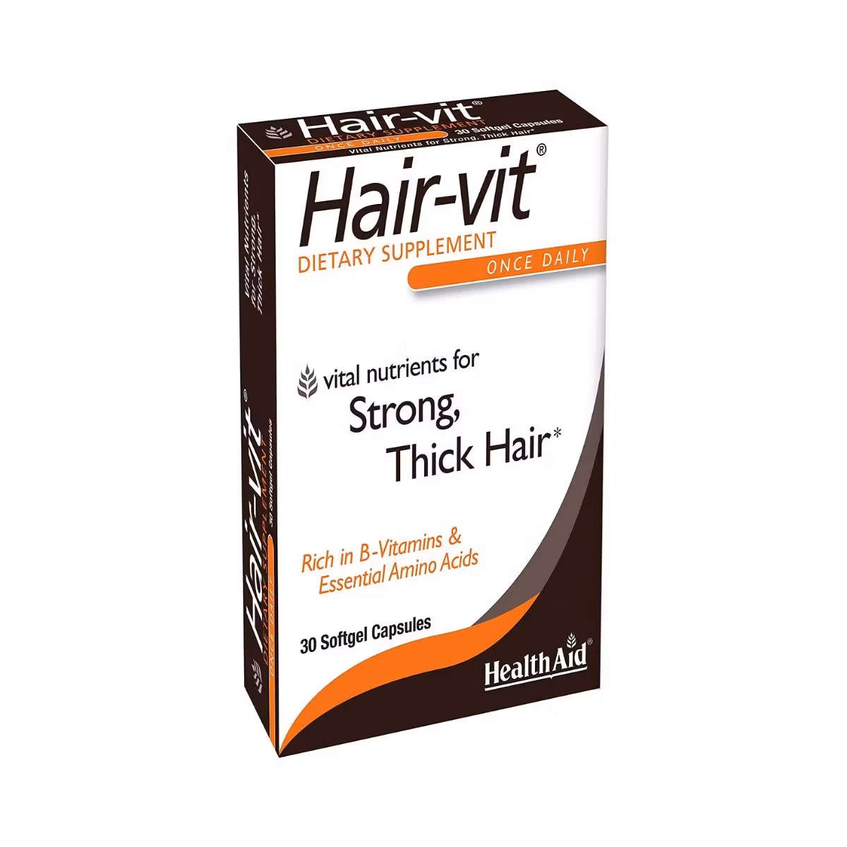 Health Aid Hair-vit është një suplement që ndihmon në rritjen e flokëve dhe mbajtjen e tyre të shëndetshme. Biotina, Seleni dhe Zinku ndihmojnë në ruajtjen e flokëve të shëndetshëm. Bakri kontribuon në ngjyrosjen normale të flokëve. Është i përshtatshëm për rënien sezonale të flokëve, për femra dhe meshkuj. Është gjithashtu i dobishëm për flokë të brishtë dhe të dëmtuar.