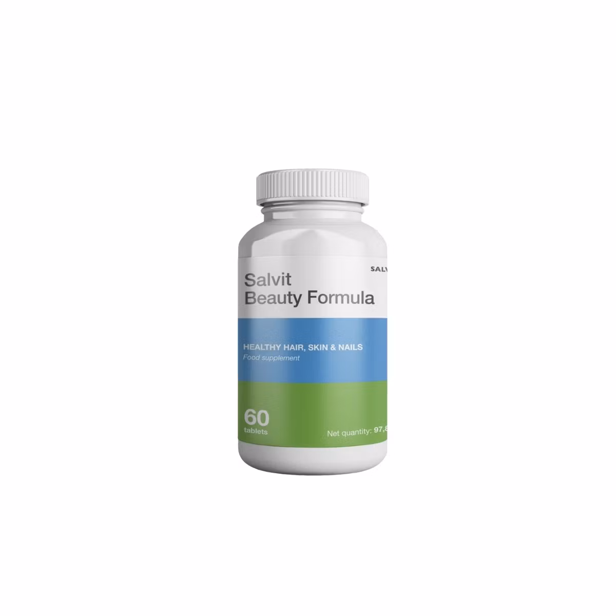 Salvit Beauty Formula Tabs 60 është një suplement ushqimor i dizajnuar për të mbështetur bukurinë dhe shëndetin nga brenda, duke promovuar flokë, lëkurë dhe thonj të shëndetshëm e të bukur. Ky produkt përmban një kombinim të zgjedhur vitaminash dhe mineralesh, duke përfshirë vitaminë C, e cila kontribuon në formimin normal të kolagjenit për funksionimin e shëndetshëm të lëkurës, ndërsa zinku dhe biotina ndihmojnë në ruajtjen e flokëve normalë dhe përkrahjen e rritjes së tyre. Përveç kësaj, vitamina A, B2, niacina, biotina, jodi dhe zinku kontribuojnë në ruajtjen e lëkurës normale, ndërsa zinku gjithashtu ndihmon në mirëmbajtjen e thonjve normalë, duke i bërë ato më të fortë dhe më rezistentë. Produkti rekomandohet për të rriturit që duan të kujdesen për pamjen e tyre natyrale duke filluar nga brenda, duke plotësuar nevojat ditore për elementë që mbështesin shëndetin dhe elasticitetin e lëkurës, forcimin e flokëve dhe thonjve, si dhe një përgjithësi më të mirë të dukjes së jashtme. Për përdorim të duhur, sugjerohen 2 tableta në ditë, me ushqim, që lejojnë trupin të përthithë më mirë përbërësit aktivë dhe të mbështesë proceset natyrale të rigjenerimit dhe mirëmbajtjes.
