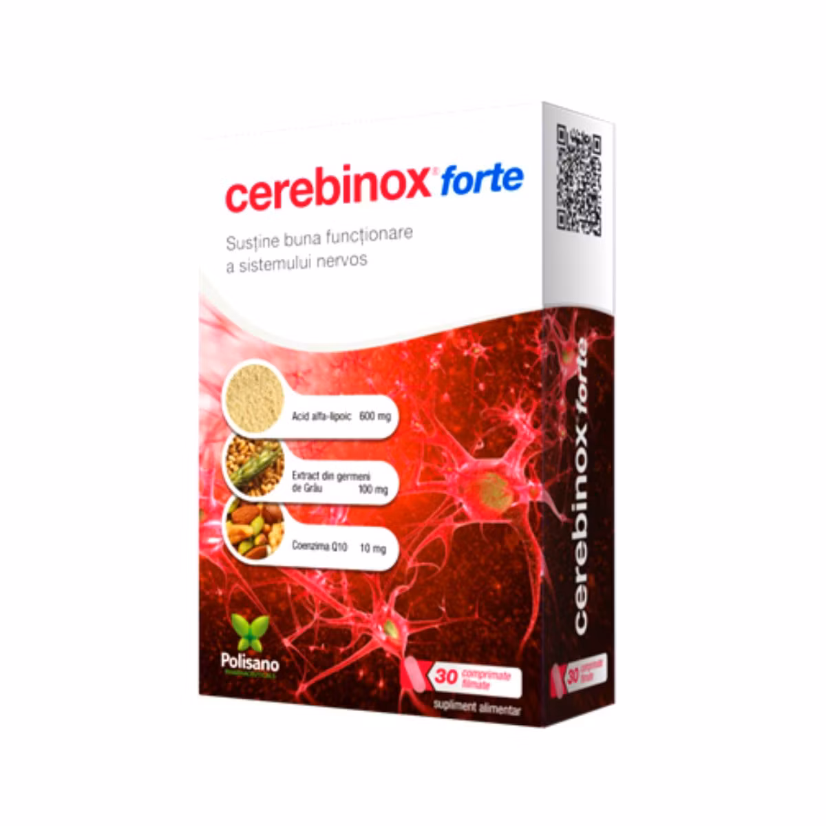 Cerebinox Forte është një suplement me acid Alfa-Lipoik, vitamina të kompleksit B dhe koenzimë Q10. Acidi lipoik kontribuon në funksionin e shumë enzimave në trup. Kompleksi i vitaminave B ruajnë funksionimin normal të sistemit nervor. Vitamina B1 kontribuon në funksionin normal të zemrës dhe vitamina B6 ndihmon në rritjen e sistemit imunitar dhe rregullimin e aktivitetit hormonal. Riboflavina dhe vitamina E ndihmojnë në mbrojtjen e qelizave nga stresi oksidativ. Koenzima Q10 ka efekte antioksiduese.