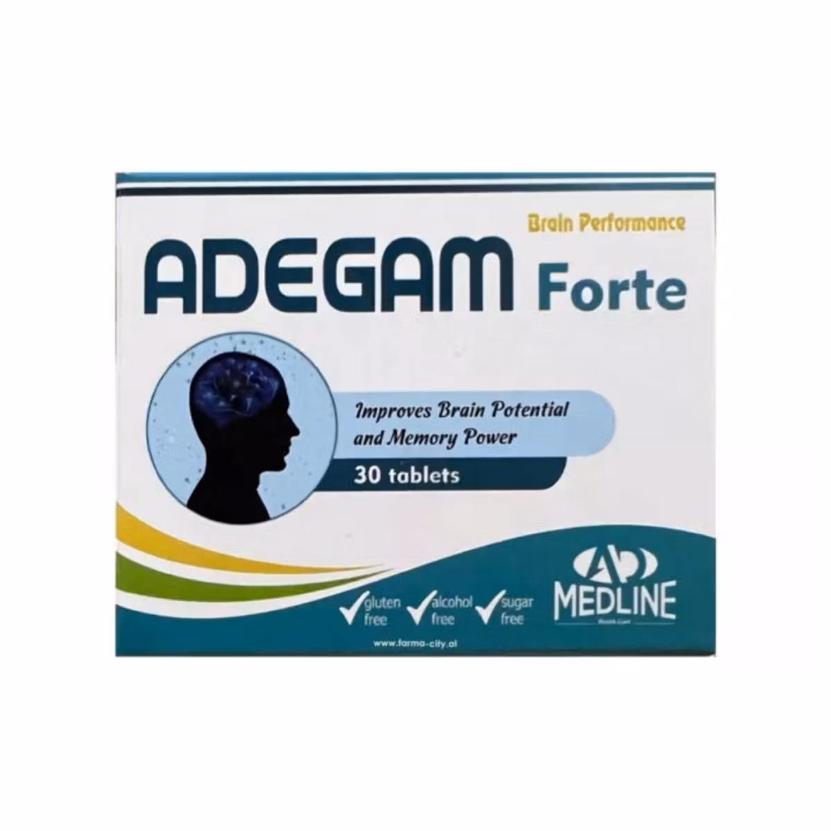 Adegam Forte është një formulë unike e Aminoacideve, Vitaminave, Magnezit dhe Gingko Biloba të cilat përmirësojnë funksionin e trurit, përmirësojnë përqendrimin dhe memorjen. Magneziumi dhe Niacina kontribuojnë në një funksion normal psikologjik, reduktimin e plogështisë dhe lodhjes.