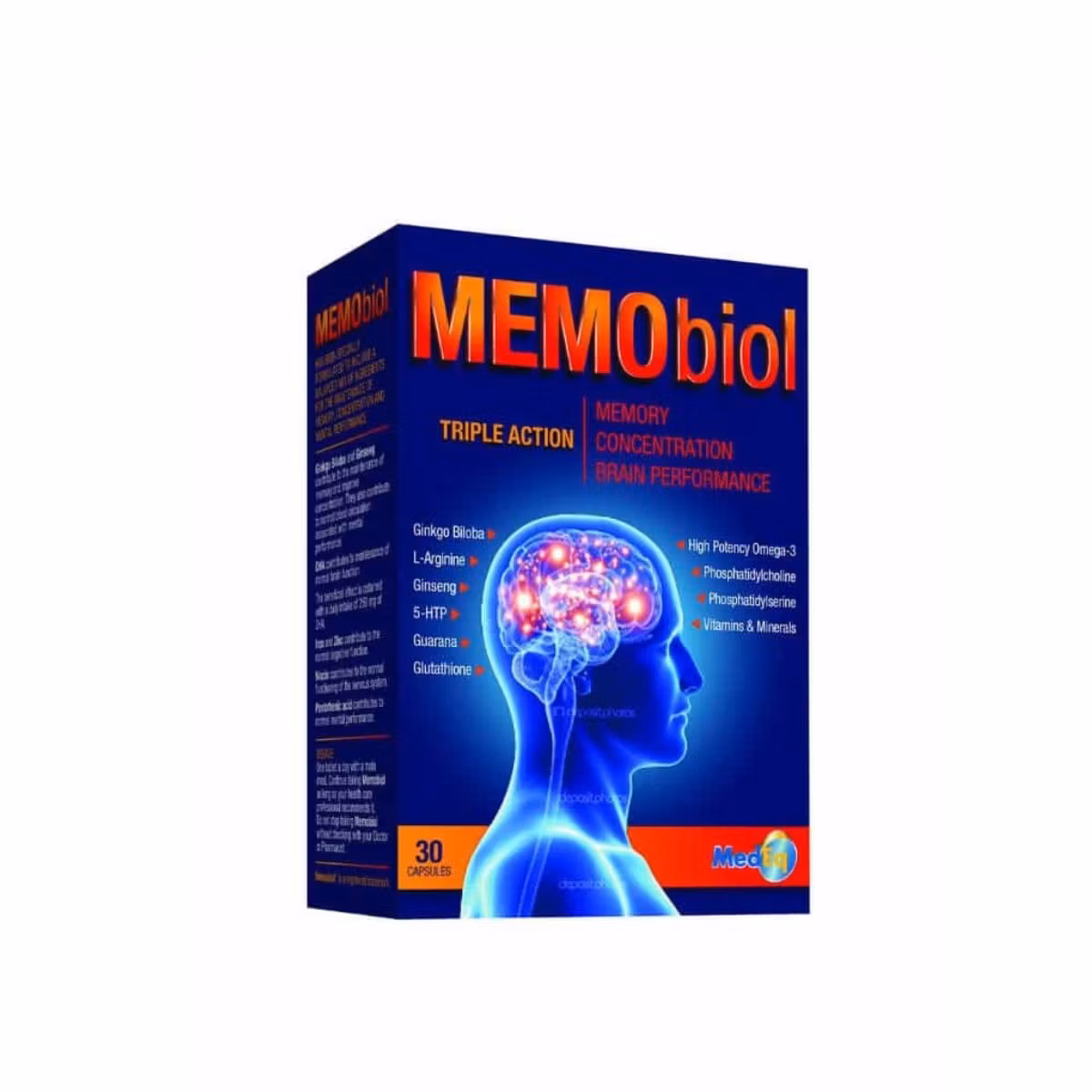 Memobiol është një formulë e plotë e zhvilluar posaçërisht për të plotësuar nevojat me lëndë ushqyese që janë të rëndësishme për zhvillimin dhe mirëmbajtjen e trurit dhe sistemit nervor qendror. Gingko Biloba dhe Xhenseni kontribuojnë në ruajtjen e kujtesës dhe përmirësimin e përqendrimit. Gjithashtu kontribuojnë në qarkullimin normal të gjakut. DHA (acidi dokosaheksaenoik) kontribuon në ruajtjen e funksionimit normal të trurit. Hekuri dhe zinku kontribuojnë në funksionin normal kognitiv (aftësinë e të menduarit). Niacina kontribuon në funksionimin normal të sistemit nervor. Acidi pantotenik kontribuon në stabilitetin mendor. L-Glutamina ndihmon në funksionimin normal të trurit. Vitamina C kontribuon në neutralizimin e efekteve të radikaleve të lira, ndihmon në përthithjen e hekurit dhe luan një rol kyç në ruajtjen e imunitetit të fortë. L-Arginina luan një rol të rëndësishëm në ndarjen e qelizave, shërimin e plagëve, largimin e amoniakut nga trupi dhe çlirimin e hormoneve. Guarana kontribuon në humbjen e peshës dhe redukton lodhjen mendore dhe fizike. 5-HTP është efektiv në trajtimin e depresionit. Seleni kontribuon në neutralizimin e radikaleve të lira potencialisht të dëmshme në trup dhe luan një rol të rëndësishëm në shëndetin riprodhues të mashkullit. L-Glutathione është një nga elementët më të rëndësishëm në trup që lufton kundër radikalëve të lirë. Bakri është i përfshirë në prodhimin e energjisë dhe në ruajtjen e nervave të shëndetshëm. Rekomandohet të përdoret për ata që kanë një mënyrë jetese shumë të shpejtë dhe stresuese, studentë dhe nxënës dhe ata që duan të ruajnë funksionin e trurit në vitet e mëvonshme.