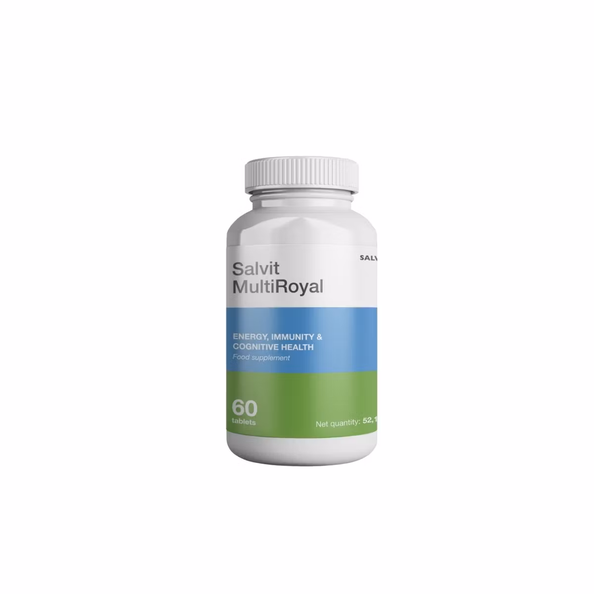 Salvit MultiRoyal Tabs 60 është një suplement multivitaminash dhe mineralesh i krijuar për të ofruar mbështetje të plotë për sistemin imunitar, energjinë dhe funksionet e trupit, i pasuruar me një kombinim të zgjedhur të vitaminave, mineraleve dhe pelte mbretërore, që njihet për vetitë e tij të pasura ushqyese. Formula përfshin vitamina të grupit B (si niacin, B6 dhe B12) që ndihmojnë në reduktimin e lodhjes dhe rraskapitjes, vitamina B1, biotinë dhe mangan për të mbështetur metabolizmin normal të prodhimit të energjisë, si edhe vitamina A, C dhe D, së bashku me selen dhe bakër që kontribuojnë në funksionimin normal të sistemit imunitar. Përveç kësaj, zinku në formulë ndihmon funksionin kognitiv, duke përkrahur përqendrimin dhe funksionet mendore gjatë ditës. Salvit MultiRoyal Tabs 60 rekomandohet që të rriturit të marrin 2 tableta në ditë, me një vakt, për të siguruar një furnizim të balancuar të këtyre vitaminave dhe mineraleve që mbështesin energjinë, imunitetin dhe mirëqenien e përgjithshme të organizmit. Është i përshtatshëm për njerëzit që kërkojnë një formulë gjithëpërfshirëse për të ndihmuar trupin të përballojë lodhjen, të forcojë mbrojtjen natyrale dhe të mbështesë funksionet bazë të shëndetit çdo ditë.