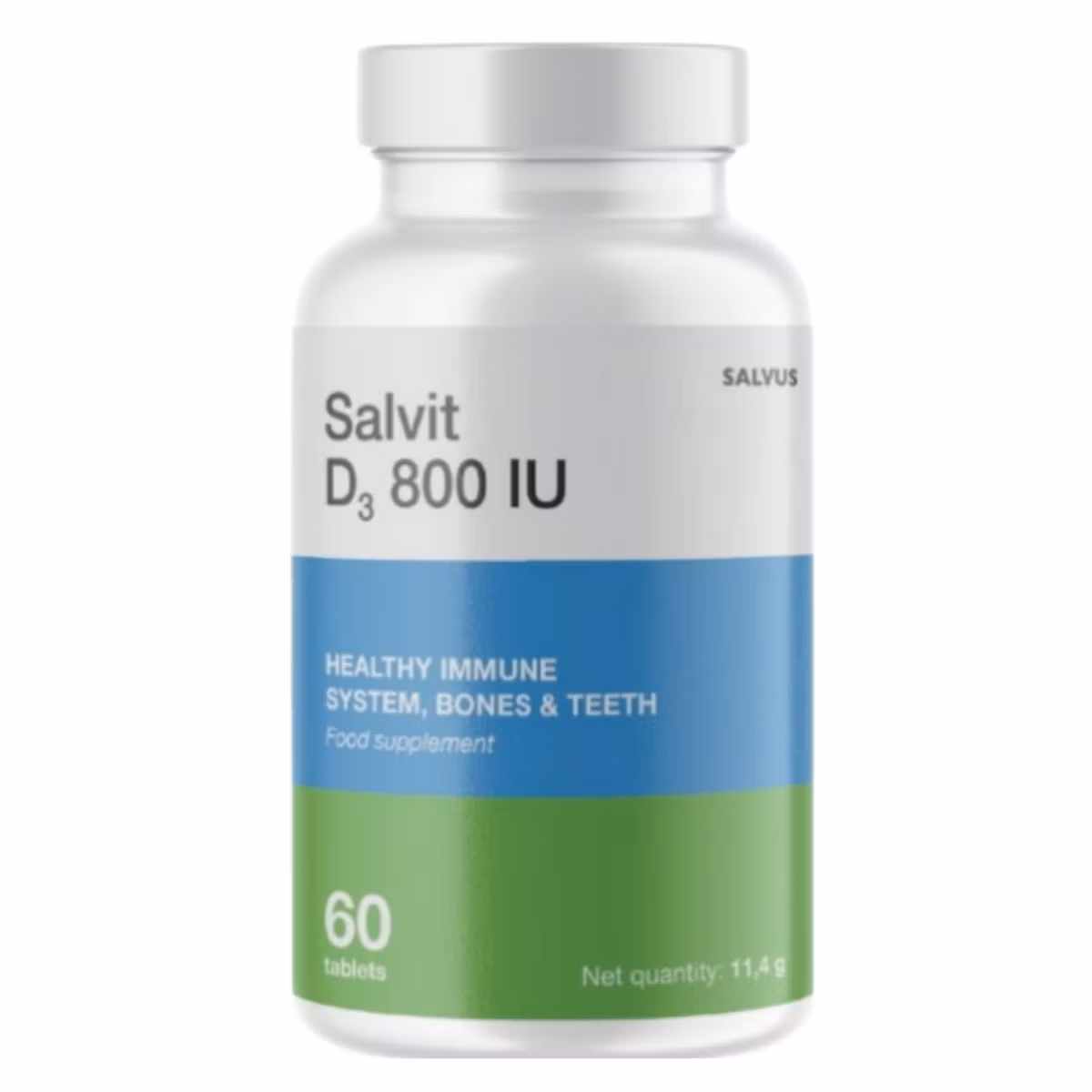 Salvit D3 Tabs 800 UI 60 është një suplement ushqimor me vitaminë D3 në tableta, ku çdo tabletë përmban 800 IU (20 µg) vitaminë D3 për të mbështetur shëndetin e trupit në mënyrë gjithëpërfshirëse. Vitamina D3, e njohur edhe si vitamina e diellit, është thelbësore për funksionimin normal të sistemit imunitar, ndihmon përthithjen dhe përdorimin e kalciumit dhe fosforit nga trupi dhe luan një rol të rëndësishëm në ruajtjen e kockave dhe dhëmbëve të fortë, si dhe në funksionin normal të muskujve.