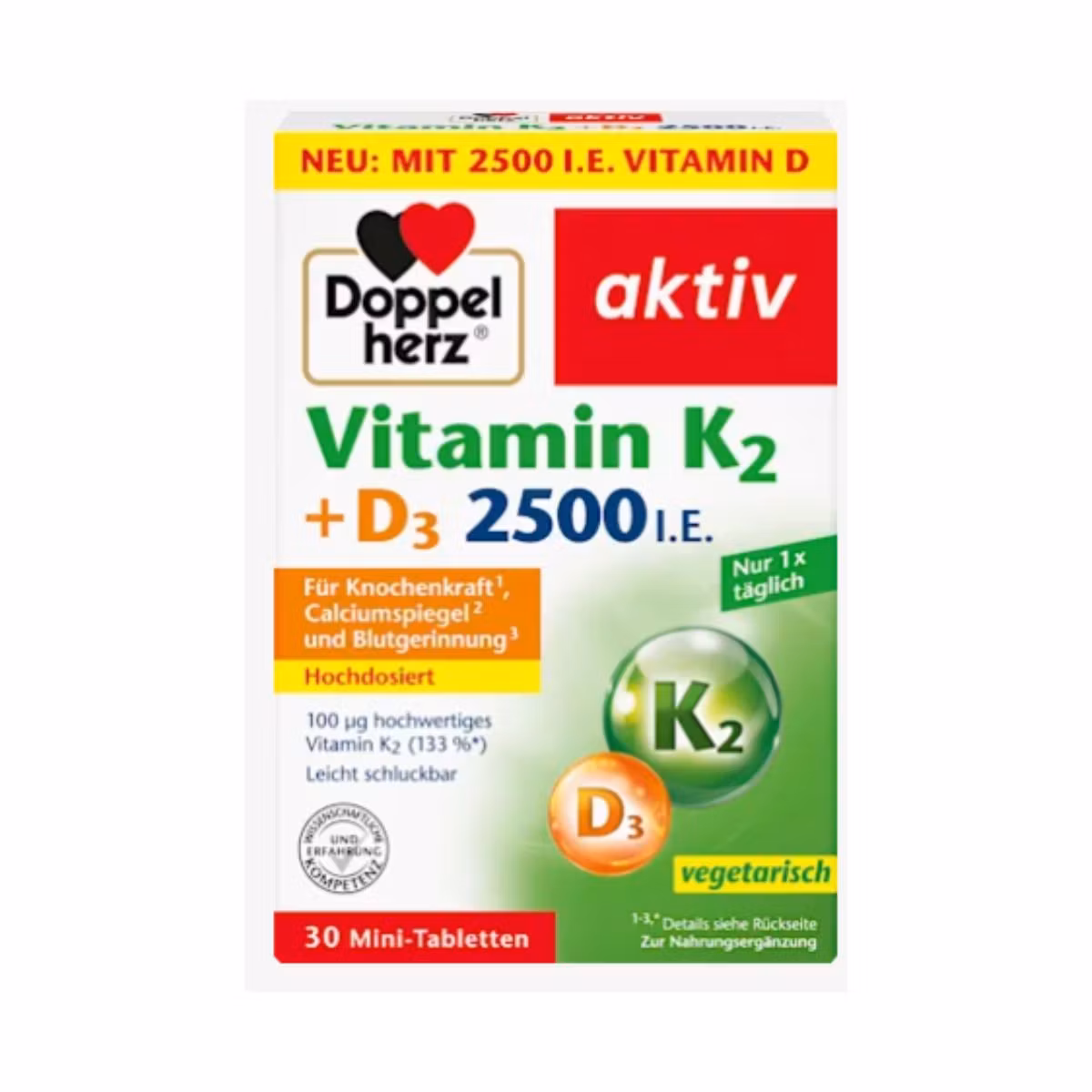 Doppelherz Vitamina K2 + D3 2500 është një suplement ushqimor me bazë Vitaminën K2 dhe Vitaminën D për forcimin e kockave, ruajtjen e nivelit të kalciumit dhe lufton mpiksjen e gjakut. Suplementi kontribuon në funksionimin normal të sistemit imunitar dhe në ruajtjen e funksionit normal të kockave dhe muskujve. Doppelherz Vitamina K2 + Vitamina D 2500 I.E. rekomandohen për njerëzit që kanë mungesë ose duan të sigurojnë një sasi shtesë të vitaminës D.