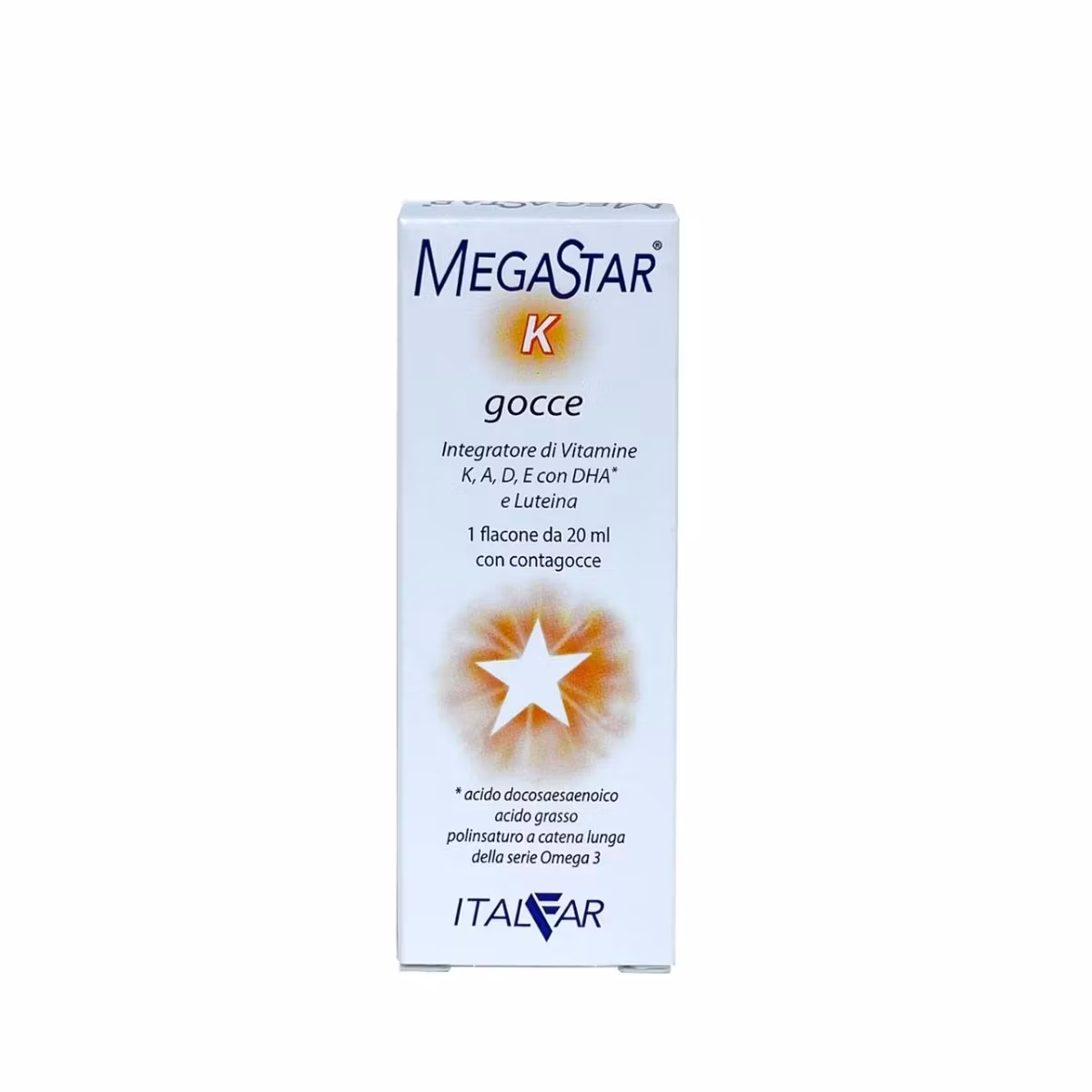 Megastar K Vitamine K është një suplement ushqimor me vitaminat K, A, D, E, DHA (acid dokosahekzanoik) dhe Luteinë. Ai shërben për parandalimin e episodeve hemorragjike te vonshme nga mungesa ose pamjaftueshmëria e vitaminës K dhe rakitizmi tek fëmijët. ADH është acid yndyror i familjes Omega 3, i rëndësishëm për rritjen dhe zhvillimin e sistemit nervor tek të sapolindurit, në sistemin imunitar, në funksionimin e retinës. Vitamina K ndihmon në sintezen e disa faktorëve të koagulimit të gjakut. Vitamina D3 nxit përthithjen e kalciumit, ndihmon në zhvillimin skeletik dhe mineralizimin e kockës. Vitamina E mbron indet nga radikalet e lira dhe ndihmon në funksionin normal të indit muskular dhe nervor. Luteina ka aftësi të mbrojë retinën nga radiacioni solar duke reduktuar në minimum progresin e sëmundjeve të syrit.